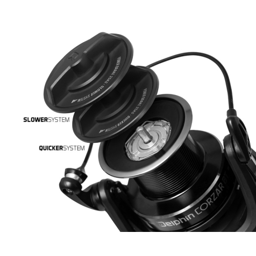 CORZAR aparține familiei mulinetelor de crap de capacitate mare produse sub marca Delphin, mulinete care excelează printr-un design deosebit. Baza mulinetei se distinge printr-un picior robust care face trecerea către corpul mulinetei construit dintr-un plastic special foarte rezistent și durabil. Mulineta este echipată cu sistem de transmisie de tip ”worm shaft” care în combinație cu cei 6+1 rulmenți asigură o rulare considerabil îmbunătățită. Mulineta CORZAR este echipată cu sistem de frânare de tip ”power brake” asigurănd o forță de frânare de până la 25 de kg , caracteristică care este disponibilă pe toate modele acestei mulinete. Sistemul de tip ”Frânare rapidă” este prezent la această mulinetă și permite tensionarea frănei printr-o singură rotire, în schimb sistemul ”Frână progresivă ” va tensiona progresiv frâna mulinetei. Deasemenea, sistemul ”anti reverse” încoporat împreună cu celelalte sisteme existente oferă opțiuni multiple în timpul drilului. Un alt avantaj al acestei mulinete îl reprezintă sistemul de lansare precisă care blochează rotirea tamburului atunci când pickup-ul mulinetei este ridicat. Tamburul metalic oferă capacitate mare de încărcare a firului astfel încât mulineta să poate fi folosită în aplicații multiple . În cutia mulinetei pe lângă cele două sisteme de frânare veți regăsi și două șuruburi de rezervă pentru fixarea mânerului.