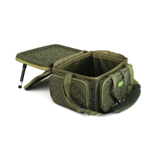Geantă de crap spațioasă cu fermoar cu masă pliabilă. Geanta este din poliester rezistent și este echipată cu o față și două buzunare laterale cu fermoare. Masuta mica are picioarele culisante permitandu-i stabilitatea pe solul neuniform. Picioarele se extind între 15 și 22 cm. O latură suficient de înaltă în jurul perimetrului mesei nu va permite ca lucrurile sau accesoriile de pescuit să cadă . Pentru confortul transportului, sunt prevăzute două mânere și o curea de umăr reglabilă cu o inserție ergonomică. Și picioarele mesei se pliază ușor și rapid, masa în sine se sprijină înapoi, se închide cu fermoar și geanta este gata pentru transport!
