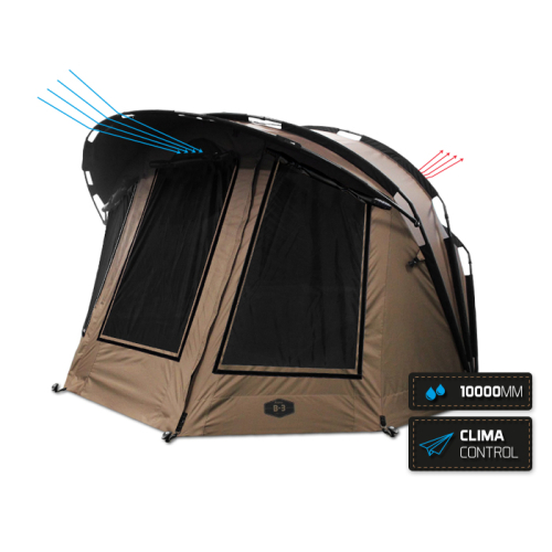 Cort complet nou creat de designeri mărcii Delphin. Datorită lor cortul este conceput în cele mai mici detalii.Construcția este tip garaj compusă din 3 coaste (nervuri) care la răndul lor sunt întărite de alte elemente. Acest lucru garantează o stabilitate excepțională chiar și în timpul vânturilor puternice sau al furtunilor. De asemenea, este posibilă o mai bună utilizare a spațiului interior. Cortul este destinat pentru un sejur confortabil de 2 până la 3 persoane, în funcție de dimensiunea echipamentelor. Dimensiunile sunt: 315x320x170cm. Datorită utilizării unui material de calitate superioară, cu o coloană de apă de până la 10000 mm și o etanșare completă a cusăturii, cortul este perfect protejat împotriva oricăror precipitații. În plus, cortul B-3 oferă opțiunea de a achiziționa un set de geamuri transparente, precum și opțiunea de a cumpăra un așternut pentru a crește rezistența termică. Cel mai important lucru la final. Cortul Delphin B-3 este dotat cu sistemul CLIMA CONTROL inovator, proiectat de departamentul de design Delphin. Acest sistem este compus din două aerisiri pe laturile opuse (deasupra ușii de intrare și deasupra ferestrei din spate). Datorită acestui sistem sofisticat, este posibil să se asigure aer proaspăt și drenare folosit în momente când nu este posibilă aerisiraea cortului prin ferestrele mari. Cu siguranță o să-l apreciați mai ales pe timp de noapte, când ajută foarte mult la reducerea condensului în interior. Întregul sistem este ușor de operat în interiorul cortului. Cortul este vândut fără pardoseală. Cu toate acestea, fermoarul este cusut în jurul perimetrului. Este o dotare pentru podea care poate fi achiziționată și care împiedică insectele sau rozătoarele să pâtrundă în cort.