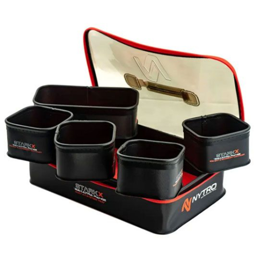 Nytro Starkx System Tray 4+1 este un set de cutii ce va ajuta radical in prepararea si pastrarea nadei. Acest set dispune de 4 cutii de dimensiuni mici si o cutie de dimensiuni mari, respectiv o geanta. Materialul din care sunt confectionate este EVA, astfel apa nu va afecta continutul, pescarul fiind linistit stiind ca nada nu este influentata de conditiile externe si ca materialul este usor de curatat si nu pastreaza mirosurile neplacute.